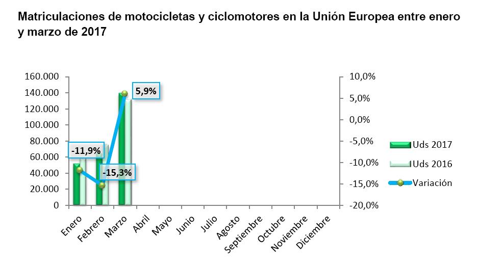 Según los nuevos datos consolidados de ambas entidades, entre enero y marzo de 2017 se han matriculado 193.191 motocicletas en Europa; lo que supone un descenso del 6,4 por ciento, respecto al primer trimestre de 2016.