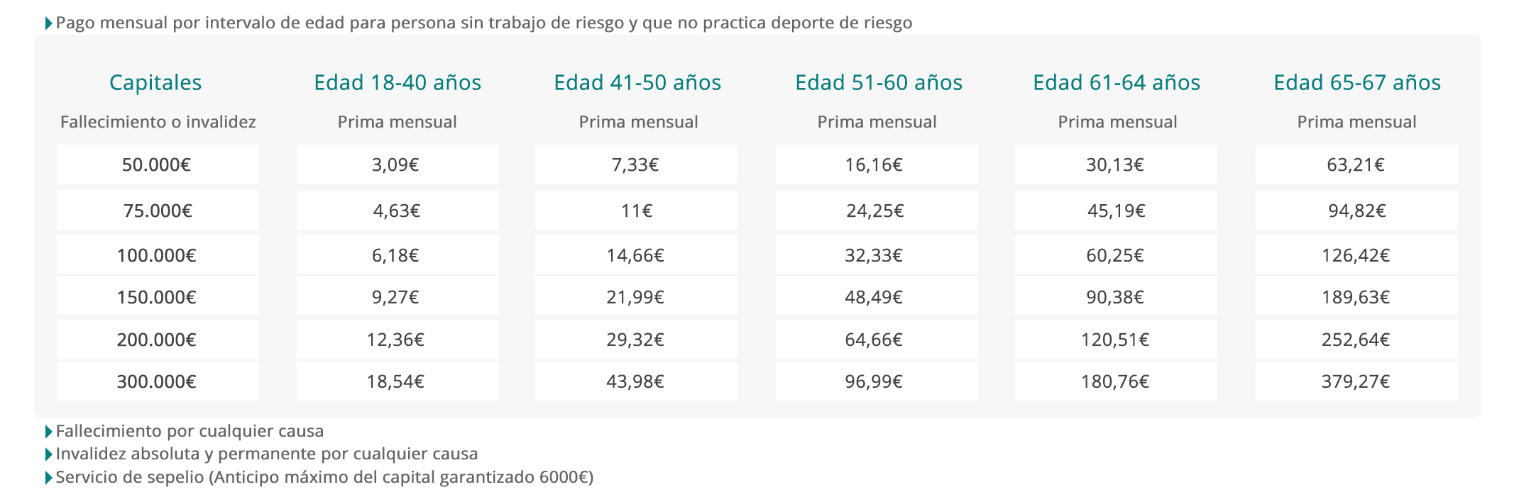 - Fallecimiento e invalidez absoluta y permanente desde 50.000 € hasta 300.000 €