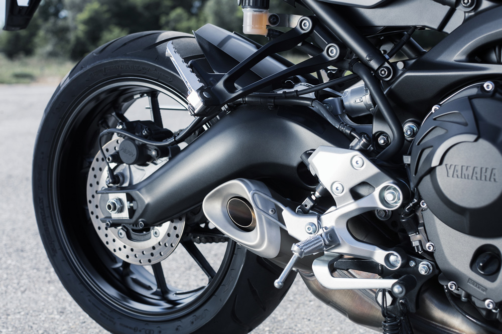 Las suspensiones y frenos de la Yamaha Tracer 900 son prácticamente similares a los de la MT 09, con un tarado algo más duro. El subchasis es más largo y robusto para poder alojar mejor a nuestro pasajero o un juego de maletas. También el basculante ha tenido que ser modificado en relación con el de la MT 09 para poder alojar un sistema de bieletas diferente. Todas estas modificaciones hablan de una moto que no es una simple adaptación de la Naked MT 09 a un modo trail, si no más bien de un modelo completamente concebido para un uso sport turismo.